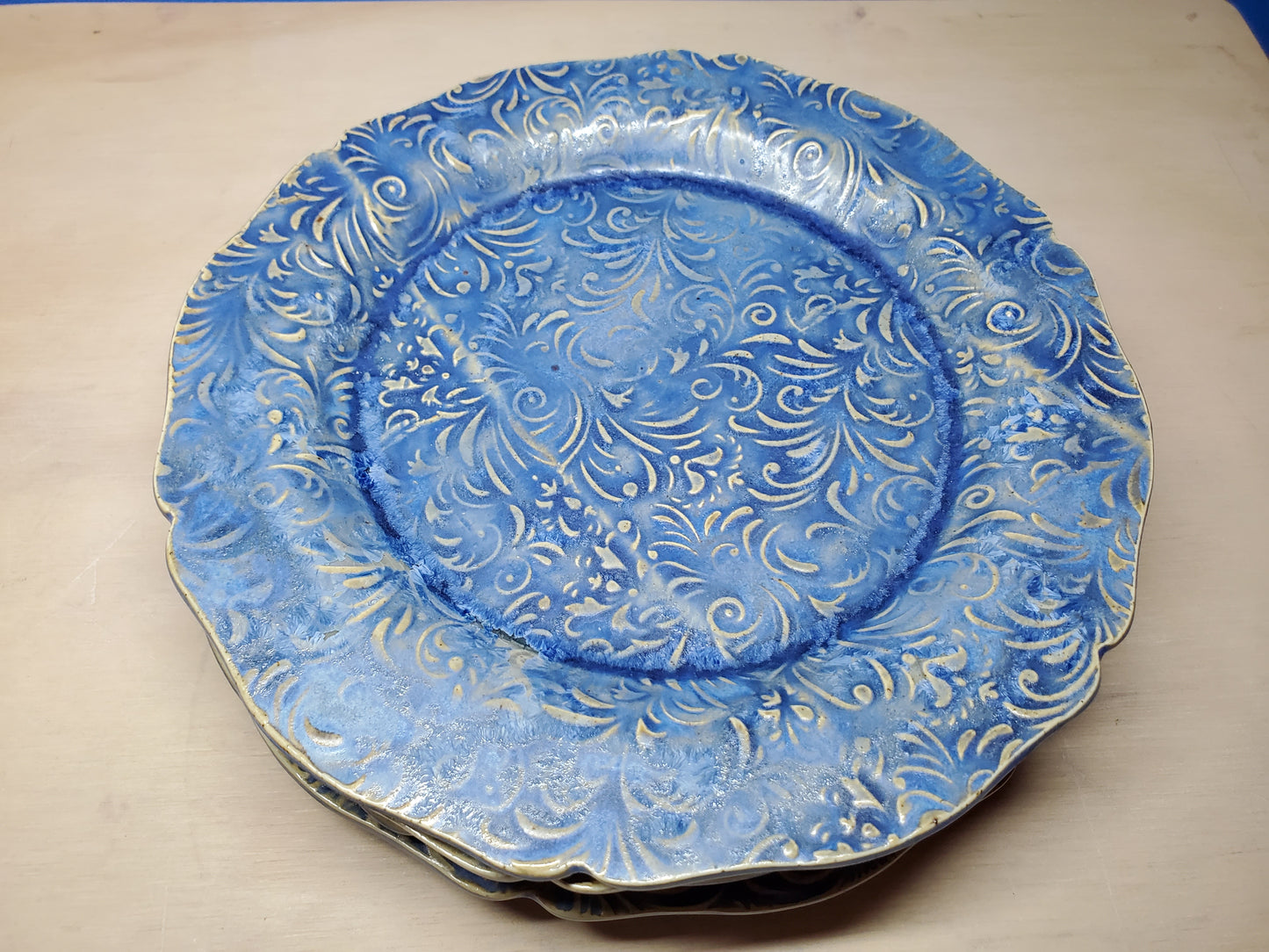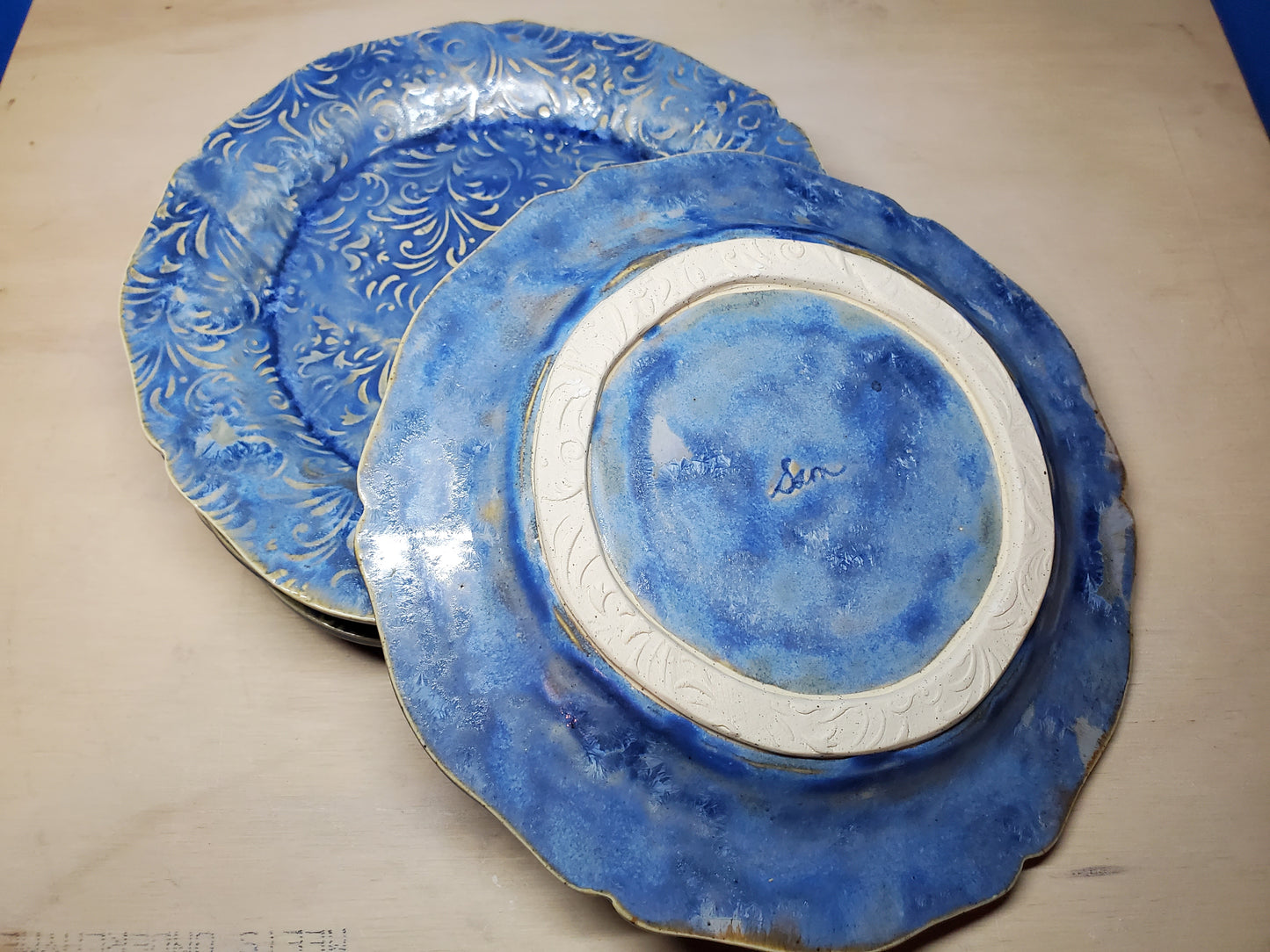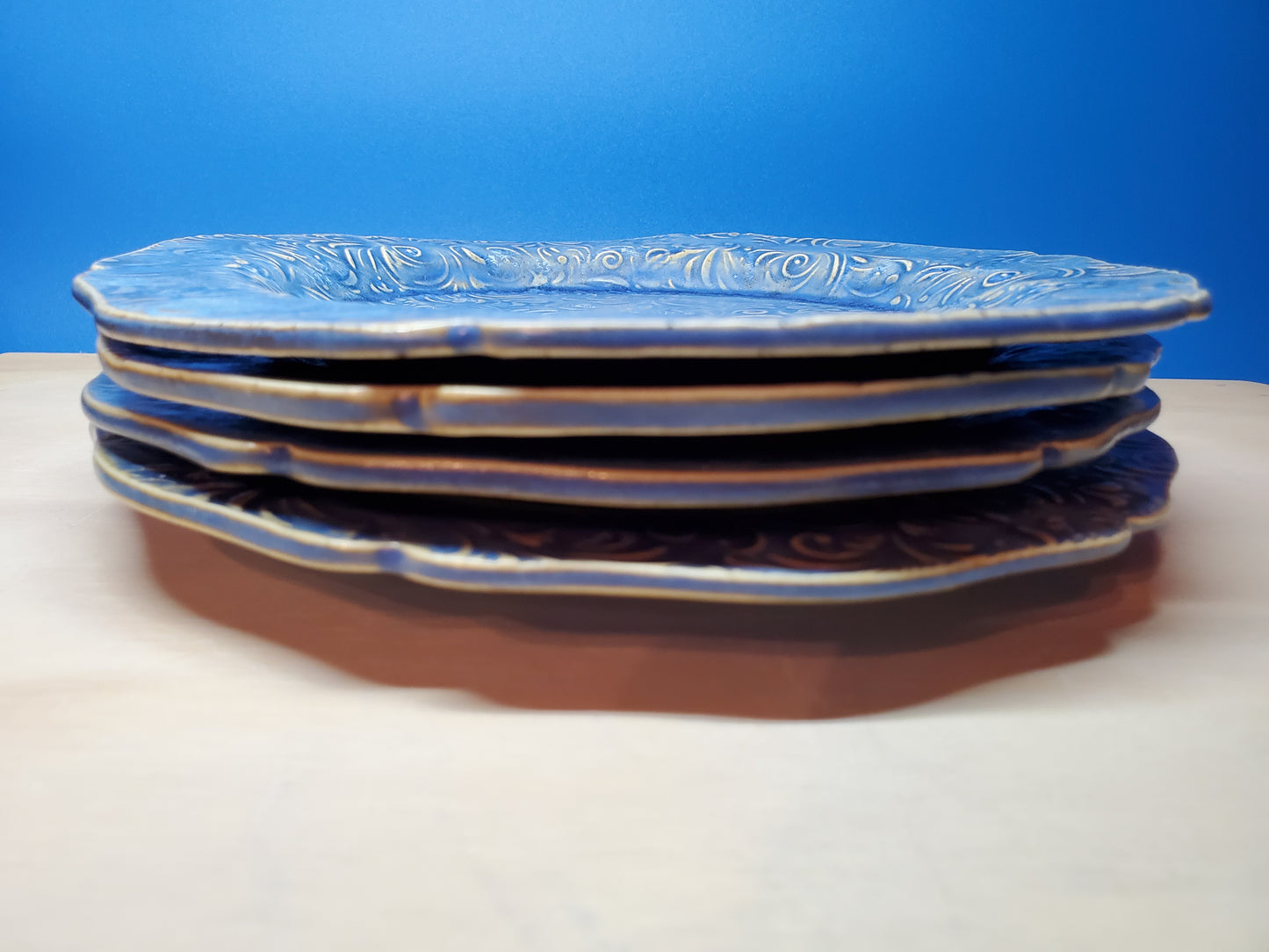 These plates are glazed blue with yellow crystals. There will be color variation from surface to surface depending on the bloom of the crystals.