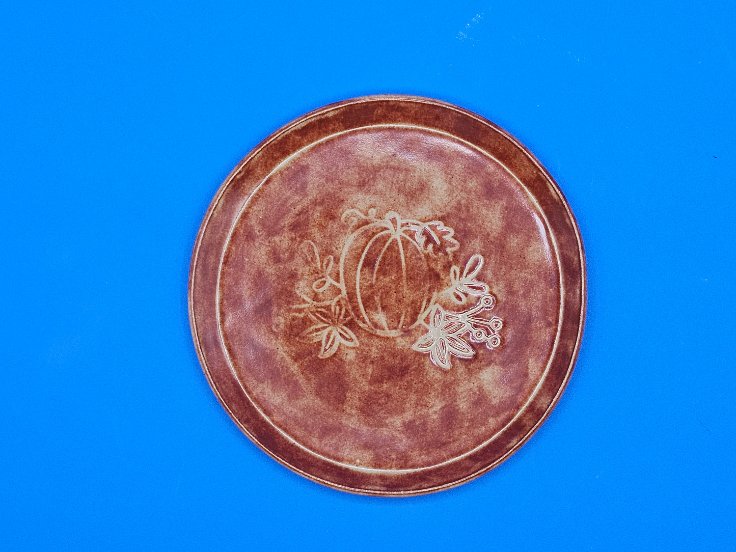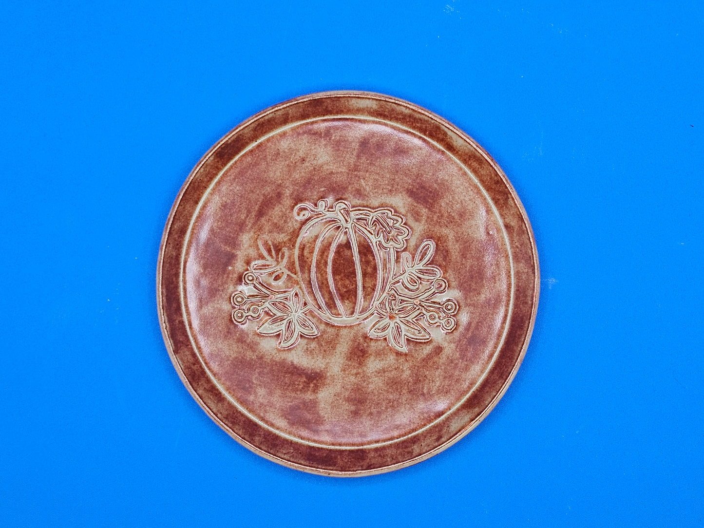 Get ready to spice up your dining experience with this Brown Pumpkin Plate! Handmade from high-quality stoneware, this round plate features an embossed pumpkin in the center and a rich brown glaze. Perfect for adding a touch of playful charm to any meal.