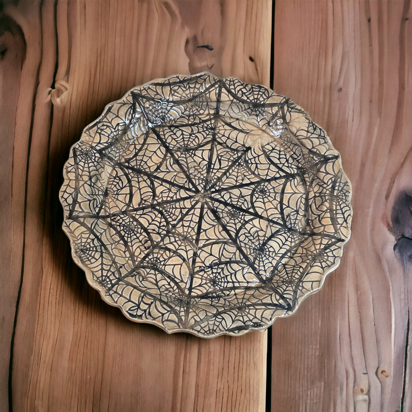 This spooktacular ceramic plate is a bite-sized treat! Carefully handmade and embossed with spider webs, it's a perfect place to serve up a few Halloween goodies. Spook your friends and family with this orange wonder that's sure to add that extra bit of Halloween charm. Trick or Treat!