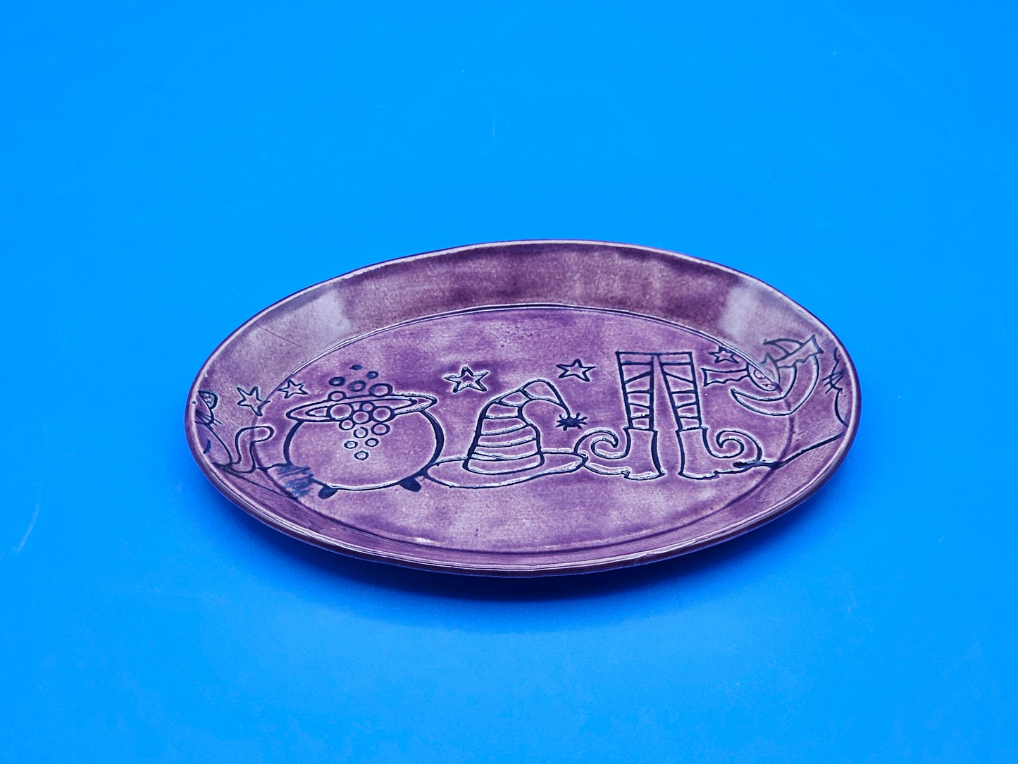 Spook up your Halloween table with these handmade purple plates! Crafted with stoneware and embossed with spooky images, these oval plates are sure to add a touch of fun to your festivities. Made with love and glazed to perfection, these ceramic plates will be a hit with your guests.