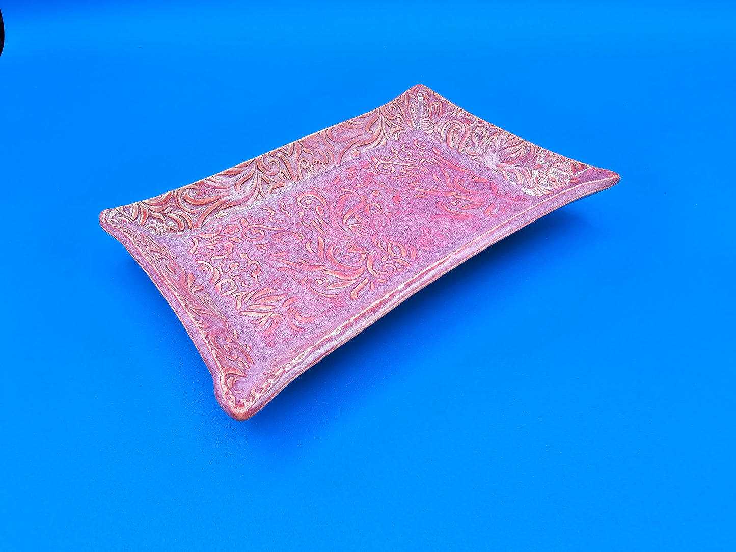 This handmade ceramic white stoneware tray is like a fiesta in a serving dish! The Sangria Red color is embossed with swirls and flowers, making it perfect for entertaining (or just treating yourself!). Put this tray to work!